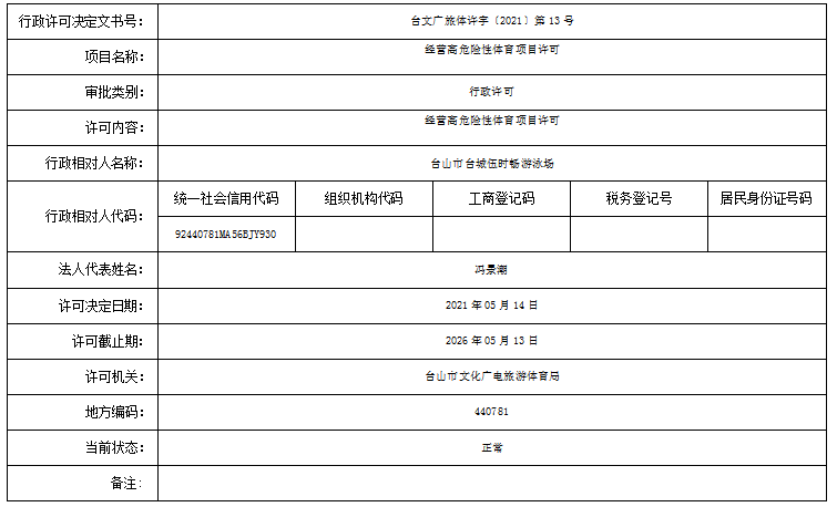 经营高危险性体育项目许可审批(台山市台城伍时畅游泳场)