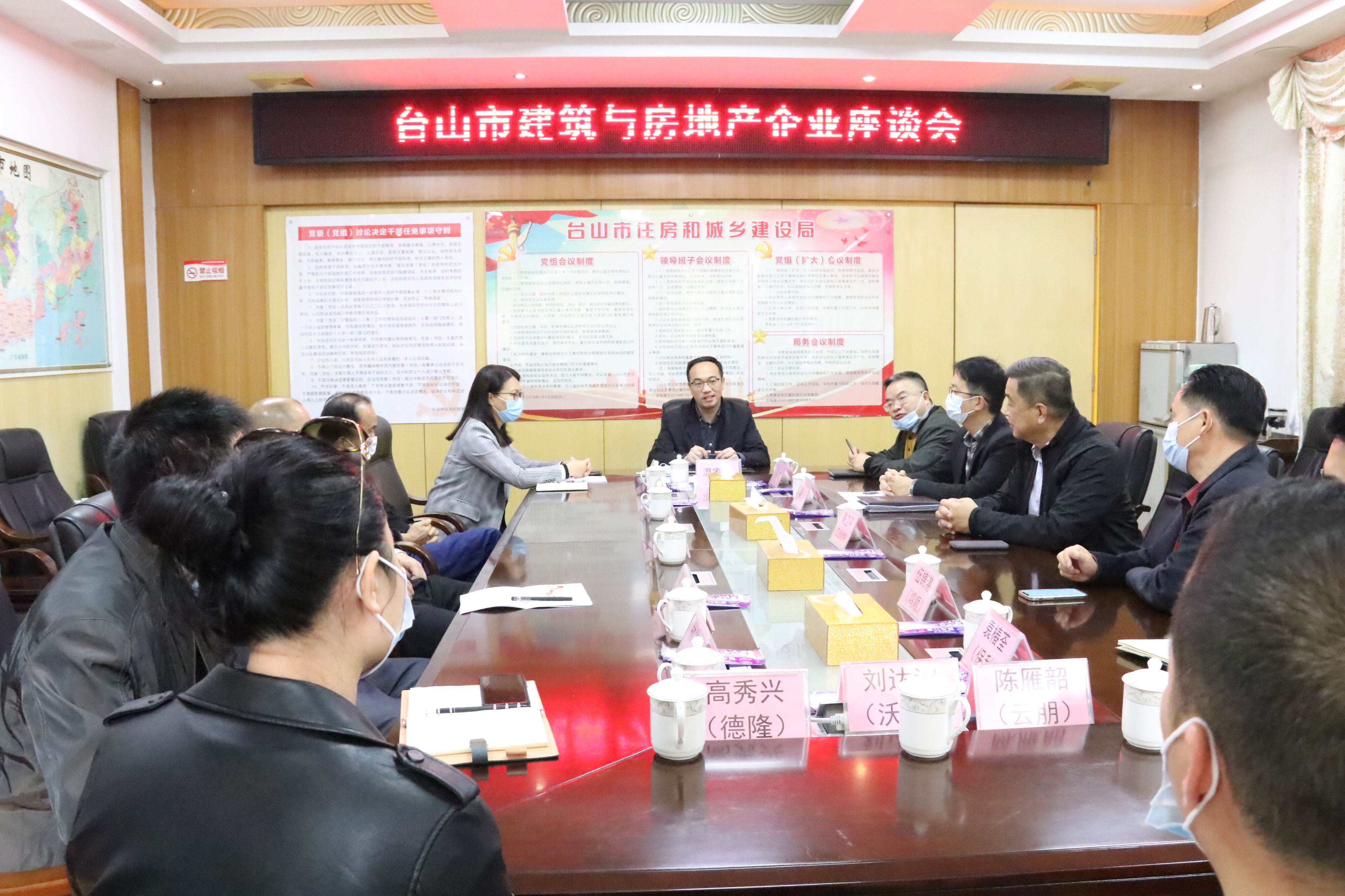 1月26日上午,市住建局召开台山市建筑与房地产企业座谈会,面对面广泛听取企业心声,谋划2021年行业新发展。温家林副市长出席会议并讲话,市住建局刘文局长、李远芳副局长、谭人任副局长以及荣华、伟明、沃华、龙湾等4家本地房地产开发企业,碧桂园、保利、德隆等3家外地房地产开发企业和浚丰、鸿顺、建邦兴业等3家本地施工单位的代表参加了座谈会。
