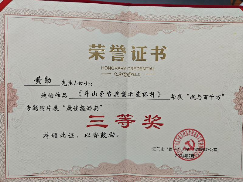 由江门发起的“我与百千万——江门推进“百千万工程”图片专题征集活动”已经圆满落下帷幕,我局黄勋同志投稿的《斗山争当典型示范标杆》荣获“我与百千万”专题图片“最佳摄影奖”三等奖。