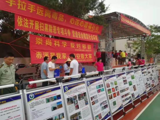 为加大辖区平安创建宣传力度,进一步提高辖区居民群众的知晓率、参与率、满意度,推动平安建设工作,营造平安和谐的氛围,10月15日,赤溪镇综治办牵头平安办、扫黑办、禁毒办、防范办、司法所、派出所等部门,在田头筊笋村举办重阳节敬老活动现场,举办了平安扫黑暨禁毒反邪宣传活动。