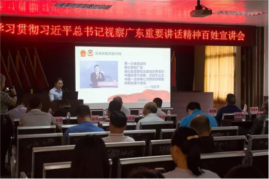 为深入做好习近平总书记视察广东重要讲话精神的宣传宣讲工作,在全市迅速掀起学习贯彻热潮,结合把庆祝改革开放40周年活动引向深入,按照中央、省委和市委的部署安排,11月13日上午,广海湾工业园区(赤溪镇)举办了“习近平总书记视察广东重要讲话精神百姓宣讲会”广海湾工业园区(赤溪镇)专场,参加本次宣讲会的人员有:园镇全体党员干部、各村(居)委会“两委”干部以及村小组长等共200多人,宣讲会由赤溪镇镇长戴志滔同志主持。