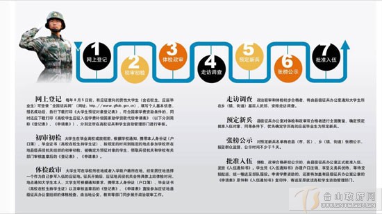 据了解,为便于适龄青年应征,全国征兵网网上登记报名已于本月初开始,比2015年提前2个月。登记提前更有利于各地扎实做好新年度征兵准备,及早展开网上兵役登记、应征报名和政策咨询,抓好高素质青年征集工作。适龄男青年可登录网站进行兵役登记和应征报名,之后根据兵役机关安排进行实地初审初检。下一步,全国征兵网还将为适龄女青年开通参军报名服务。