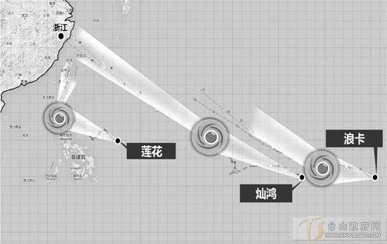 目前在西太平洋上一字排开的三个强热带风暴:“灿鸿”、“莲花”、“浪卡”,形成了三台争霸的罕见现象,从最新路径预报图看,其中“莲花”可能加强到台风级别,并于8日前后登陆或擦过台湾南部沿海,之后在台湾岛附近回旋并逐渐减弱;也可能登陆或擦过台湾南部沿海后,西行进入台湾海峡,并于9日前后登陆或擦过福建沿海。10日前后,“灿鸿”将可能以强台风或超强台风强度(即15~17级)趋向浙闽沿海地区。“浪卡”目前离大陆尚远。