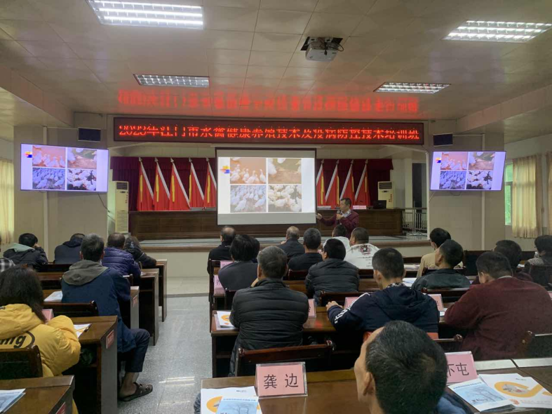 培训班特邀佛山科学技术学院黄淑坚教授和黄得纯教授,围绕品种改良、健康养殖、精准饲喂技术、提高水禽的单产水平和饲料报酬的方法进行专题讲解。培训班为现场人员送去兼具学术性与实用性的引领和指导,对水禽养殖户们存在的疑问、难点进行了解答,理论与案例结合相得益彰、通俗易懂。