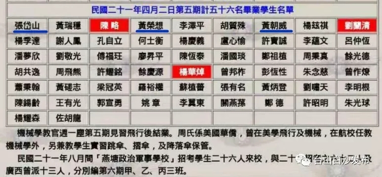 上一期《走进占庐——探索还原航空先烈:黄朝威及其家事》发布后,在黄河先生所属的广东航空英烈群中激起了强烈反响,我们也收到了热烈反馈。其中,台山水步籍航空英烈张岱山的儿子,分享了民国二十一年(1932年)航空学校第五期56名毕业生的名单,我们发现了与黄朝威同期,黄薇父亲——黄荣想的名字。如果黄朝威在我国航空史上是“点点斑驳”,那么黄荣想便算是“无痕无迹”了。