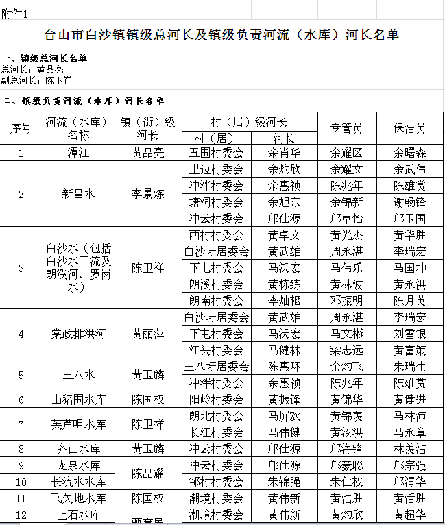 根据《中共中央办公厅 国务院办公厅印发〈关于全面推行河长制的意见〉的通知》(厅字〔2016〕42号)、《中共广东省委办公厅广东省人民政府办公厅关于印发<广东省全面推行河长制工作方案>的通知》(粤委办〔2017〕42号)精神,以及江门市台山市委、市政府工作部署,为切实加强我镇推进河长制工作的组织领导和统筹协调,完善组织架构,建立长效机制,镇委、镇政府决定成立白沙镇全面推行河长制工作领导小组,领导小组成员名单如下: