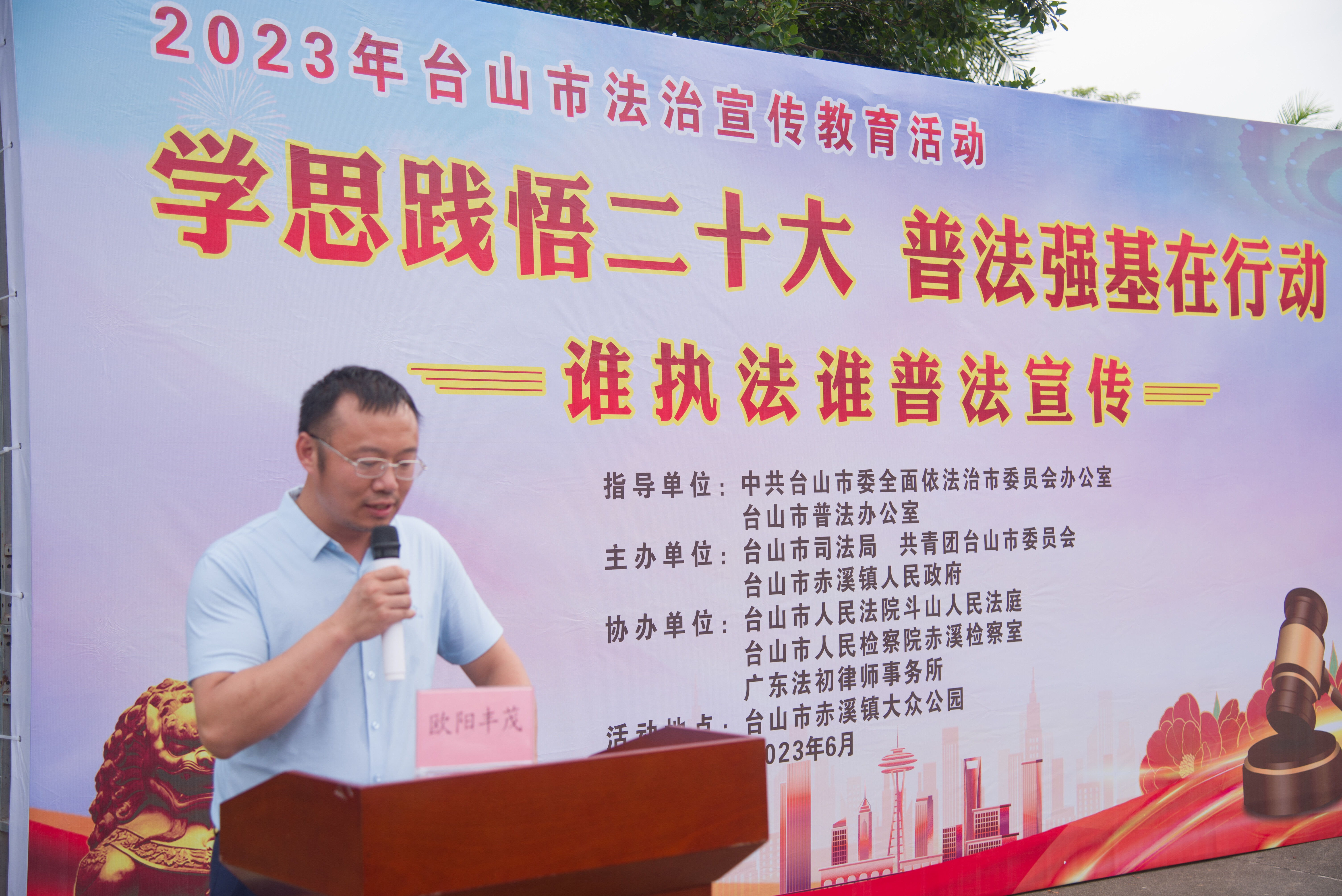 在赤溪镇大众公园活动现场,赤溪镇党委副书记黄凯坚为活动致辞,强调落实“谁执法谁普法”普法责任制是作为提高执法公信力、增强全民普法实效的重要抓手;是切实履行国家机关在法律实施过程中传播法律知识、弘扬法治精神、建设法治文化、塑造法治信仰的重要职责。希望通过一系列的普法宣传活动,让越来越多的群众能够自觉依靠法律解决各类矛盾,形成遵守宪法和法律及自觉履行法定义务的良好习惯。