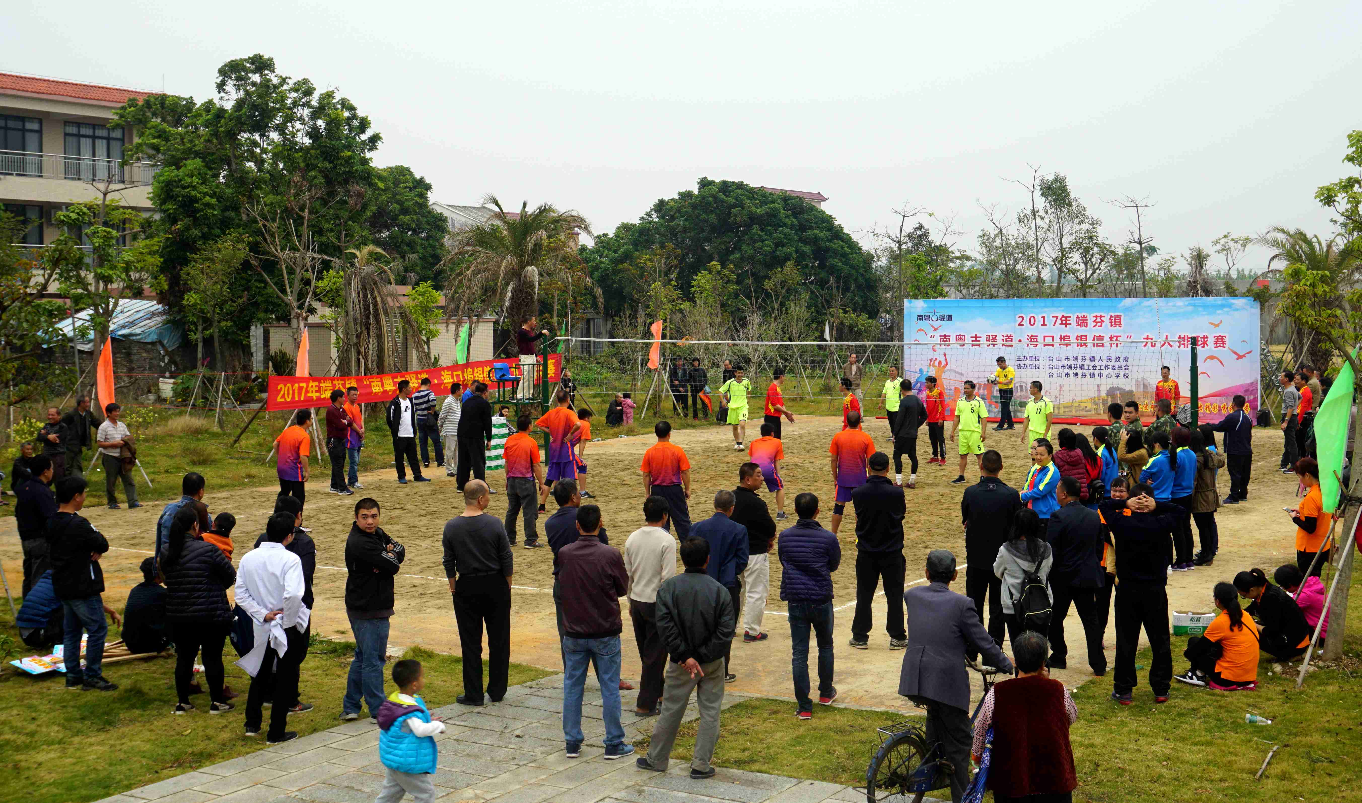 为进一步推进全民健身活动,台山市端芬镇于12月26日起举办为期三天的2017年端芬镇“南粤古驿道·海口埠银信杯”九人排球赛,来自端芬辖区的村(居)、部门单位等10多支队伍100多名队员参赛。决赛于12月28日下午在台山海口埠银信纪念广场旁的排球场举行,吸引了周边100多名群众围观。