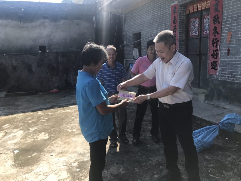 李新潮一行来到隆文村委会冼明芳家,详细地了解冼明芳在广州住院治疗情况和其家庭的生产生活状况,鼓励其增强信心,战胜病魔,并为他送上慰问金和慰问品。