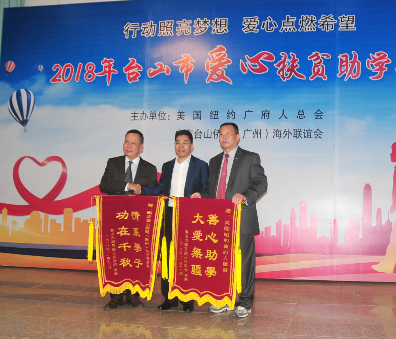 由美国纽约广府人总会、广东台山侨属(广州)海外联谊会主办的爱心扶贫助学行动,于2018年11月18日在端芬镇人民政府礼堂举行。市委常委、统战部长李白云,市教育局、外侨局、端芬镇领导,以及美国纽约广府人总会创会主席容艺辉、广东台山侨属(广州)联谊会会长陈健文等领导嘉宾出席。