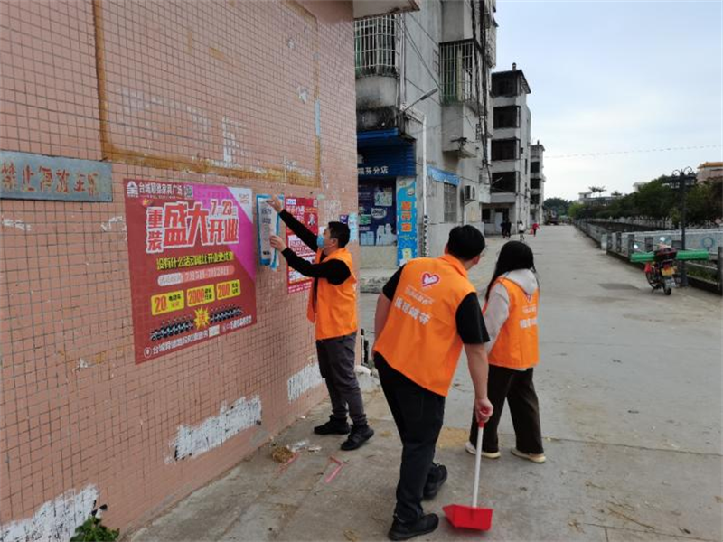 活动中,镇村两级干部还带领广大群众排查辖内过期、破旧的广告、横幅,撕拉洗刷张贴的“牛皮癣”,涂抹遮盖临街建筑物、设施上的涂写刻画。