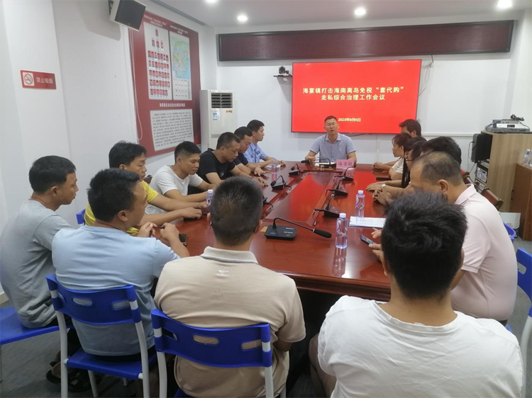 海宴镇于2023年9月6日组织有关部门和各村(社区)召开打击海南离岛免税“套代购”走私综合治理工作会议,传达《关于进一步加强海南离岛免税“套代购”走私综合治理的通知》文件精神和工作要求,专题研判分析当前我镇“套代购”走私形势,部署打击海南离岛免税“套代购”走私工作。