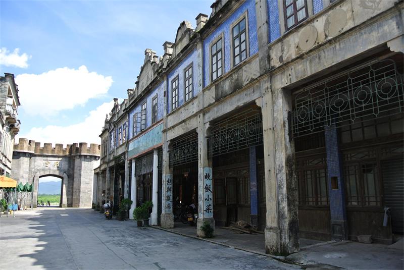 冈宁圩形成于20世纪20年代,全盛于30年代。为台山县新昌区独冈乡(今冈宁村域时属新昌区独冈乡)黄姓所创建。“冈宁”称谓始于1923年始设圩时,寓意“地属独冈乡,治属新宁县”(时新宁县已改称台山县,但民间仍沿称新宁)。建圩初期以竹、木、葵搭蓬为铺,1927年因中心店铺“杏记木店”起火而全圩尽毁,次年由冈宁水口村吕宋华侨倡议重建冈宁圩,聘请当时广州著名建筑师黄大韶(冈宁英管村人)主持建圩工程,于1930年竣工。全圩共建成102间连体二层楼商铺,建筑特色中西合璧。并建置三个临江码头和一座碉楼。由此,冈宁圩商贸活动日渐繁荣,成为当时台山北部地区重点水上运输装卸地和商品集散地之一,吸引了台山开平恩平等地商人前来经商。抗日战争后,作为商贸集圩,冈宁圩走向衰落。至80年代改革开放,冈宁圩以其便捷的水上交通条件和充裕厂房(商铺)条件,以民营企业集聚发展方式再度勃兴。至90年代初全盛时期,全圩有五金、塑料、造纸、纸品加工等20多家工业企业。近年因陆路交通发达,水上交通式微,冈宁圩企业逐步向台城、三埠、水步圩等城镇迁移发展,冈宁圩复归沉寂。但其独具特色的建筑风格及其完好无损的原始状貌,却日显其历史文化价值,引起文化界的关注。2009年,电影《让子弹飞》剧组选中冈宁圩作拍摄外景点,投资300多万元增设门楼等景观,并在此完成一些重要场景拍摄。继而大型电视剧《将军》剧组于20101月选点冈宁圩作外景配景拍摄。之后,冈宁圩凭着其独特、淳朴的建筑风格获得电影《一代宗师》、电视剧《决战1929》的剧组选为外景拍摄地之一。