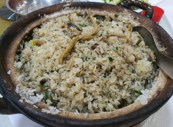 黄鳝喜欢生长于水圳、田野之中。四九人心目中认为用黄鳝焗饭可以祛黄皮、养颜。其制法一般是1公斤靓米配1公斤黄鳝,首先把生黄鳝拆骨后,待米饭将熟时,把经过适量的花生油、精盐和靓酱油等佐料炮制后的鳝肉放入饭面,经十分钟左右即可食用。其鳝骨可以与腐竹、芫茜,再加少许川芎、白芷一起煲汤。黄鳝饭和鳝骨汤不但香甜可口,还有养颜降血压之功效。