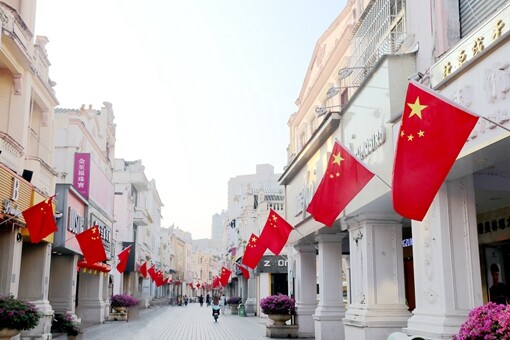 ▲商业步行街国旗飘扬