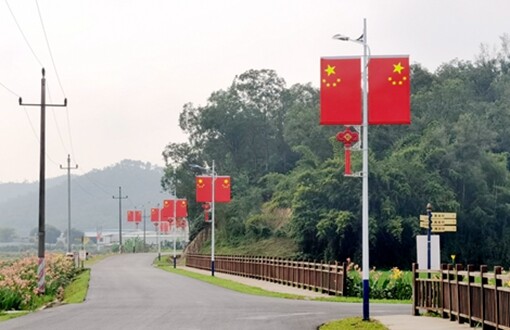▲乡村路边悬挂国旗和中国结