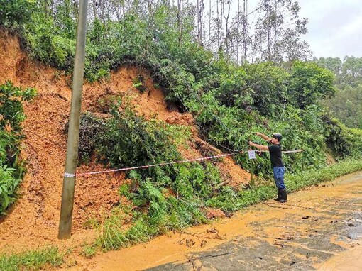▲在山体滑坡处拉警戒线