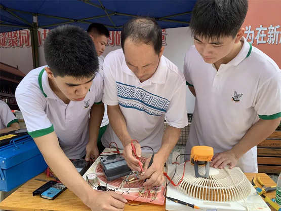 活动还没开始,不少群众就在镇政府门前等候,迫不及待地将家里有故障的电风扇、电热水壶、电饭煲、吹风机等小家电让志愿者们“会诊”。培英学生们认真查找故障原因,卸螺丝、检测、换零件、安装……仔细检查每一件小家电存在的问题,进行快速维修处理。短短一个早上,学生们就维修了50多件电器。群众纷纷为培英师生的专业技艺和志愿者精神点赞,纷纷竖起了大拇指。