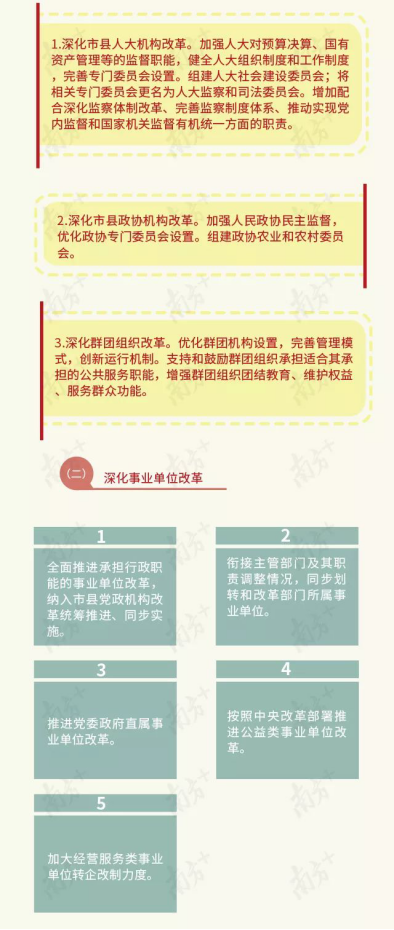 市县机构改革是深化地方机构改革的重要组成部分和关键环节。按照中央和省委统一部署要求,市县将着力改革机构设置,优化职能配置,创新体制机制,合理划分事权,理顺权责关系,构建系统完备、科学规范、运行高效的市县机构职能体系,构建简约高效的基层管理体制。(具体情况见“一图读懂广东市县机构改革”)