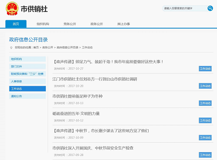 根据《条例》要求,市供销社按照规范要求,及时以信息简报、集约化网站、微信、微博等形式进行发布,主动宣传政务信息,主要公布内容有:党务公开、政务公开、人事任免、规章制度、廉政建设、服务三农、新网工程等,(由于政府网站集约化后,由于栏目的限制,部分信息不再在新网站上显示)。