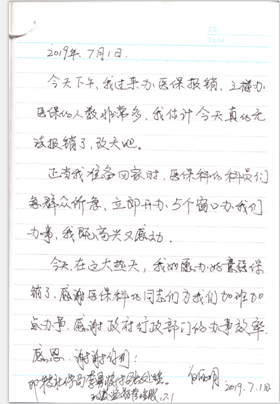 “在这大热天,我如愿办好了医保报销了,感谢医保的同志们为我们加班加点办事,感谢政府行政部门的办事效率。感恩,谢谢你们。”7月1日,群众伍丽明女士在市行政服务中心意见簿留言,对市社保局医疗保险待遇股的优质服务表示感谢。