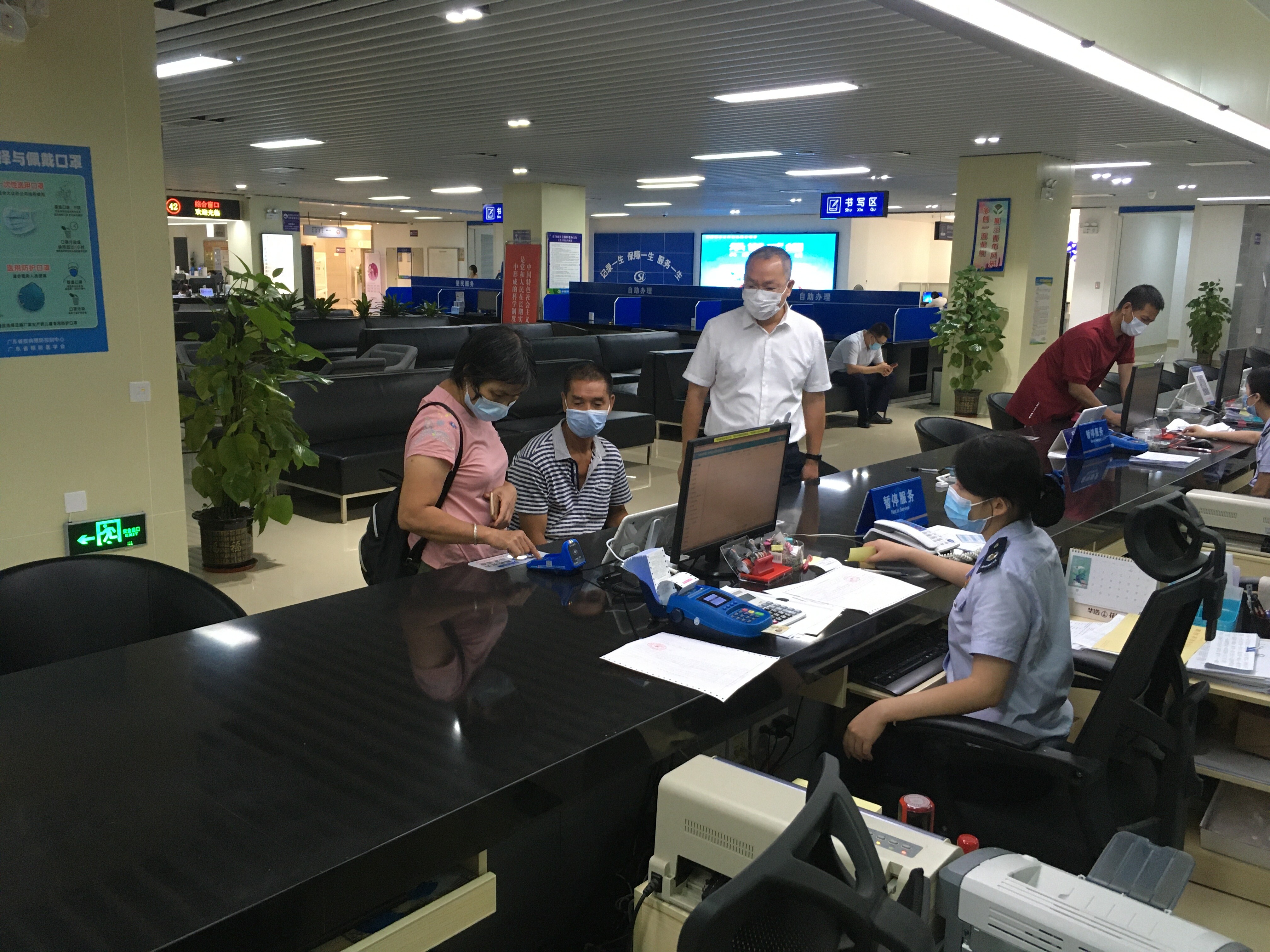 2021年7月28日,台山市社保局党支部书记、局长李勇波来到台山市行政服务中心社保局稅险联合办事大厅,陪同办事群众,以普通群众身份体验一次性缴医疗保险费流程。李勇波同志向工作人员询问了等候叫号、表格填写、办理时限、办理次数,以及稅险部门业务衔接等情况,从窗口受理材料,到填写递交申请表,再到稅险数据交换,最后缴费出单,每到一处,都进行体验了解,并与现场办事群众一道体验办事流程、交流办事感受,全流程全覆盖“跑”一遍。体验过程中,李勇波同志向办事群众详细询问对窗口服务是否满意、业务办理是否方便快捷,还有哪些需要改进的地方。办事群众对本次一次性缴医疗保险费业务办理过程表示满意,对社保服务表示肯定。