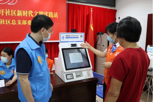 ▲台山市冲篓镇志愿者使用“粤智助”政府服务自助机帮助群体打印“粤康码”(拍摄者:覃巧兰 拍摄单位:台山市冲蒌镇官窦村村委会)